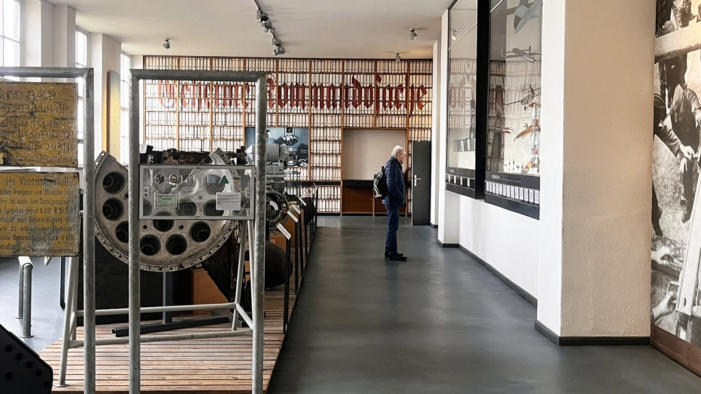 Auch die Auslagerung der Waffenproduktion in einen Stollen in der Nähe von Nordhausen am Harz nach britischen Bombenangriffen im Jahr 1943 ist ein wichtiges Thema. Die menschlichen Bedingungen in den Stollen und dem dazugehörigen KZ sind Thema der Dauerausstellung.