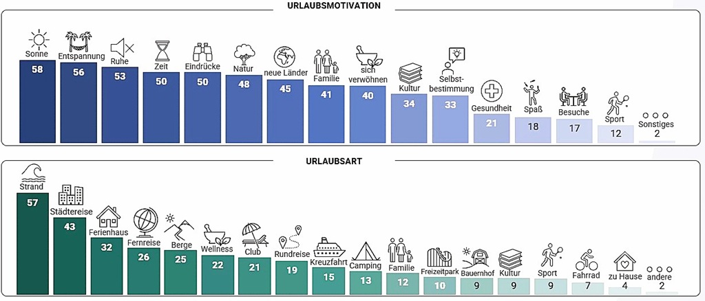 Sonne und Wärme stehen für die meisten Deutschen ganz oben auf der Wunschliste. Ebenso wichtig sind Entspannung sowie bewusst Ruhe zu haben und dem Alltagsstress zu entkommen. Erst danach folgen Motive wie Zeit für sich selbst oder für die Familie, neue Eindrücke zu sammeln oder die Natur zu erleben.